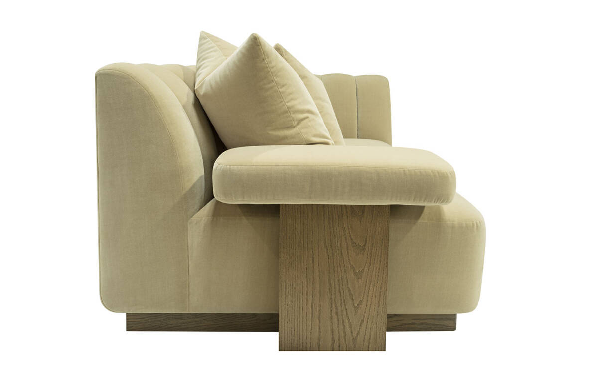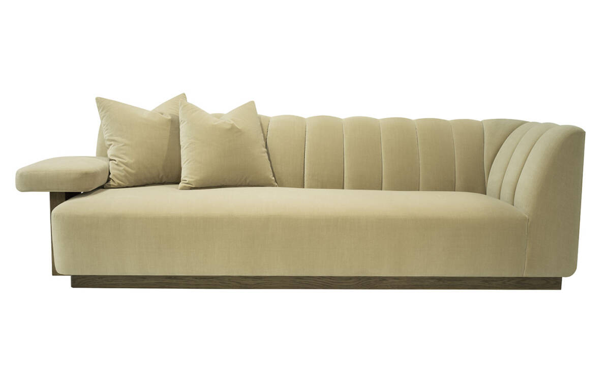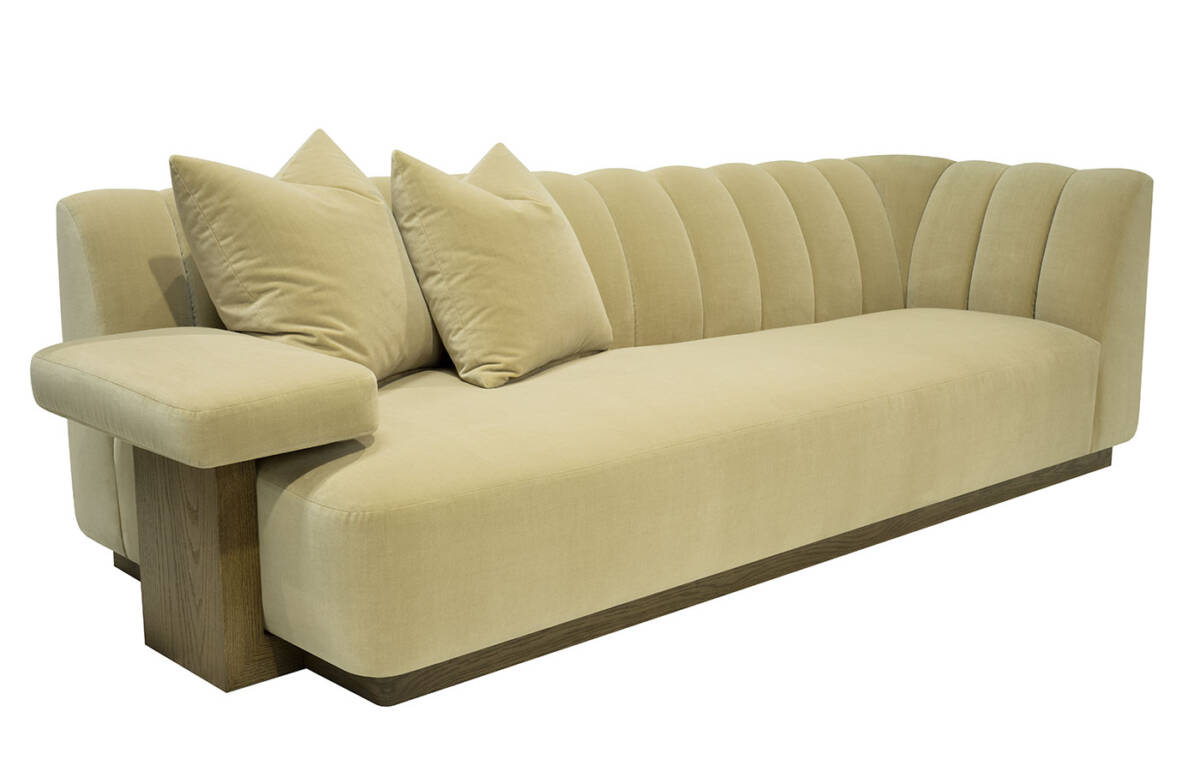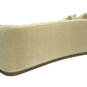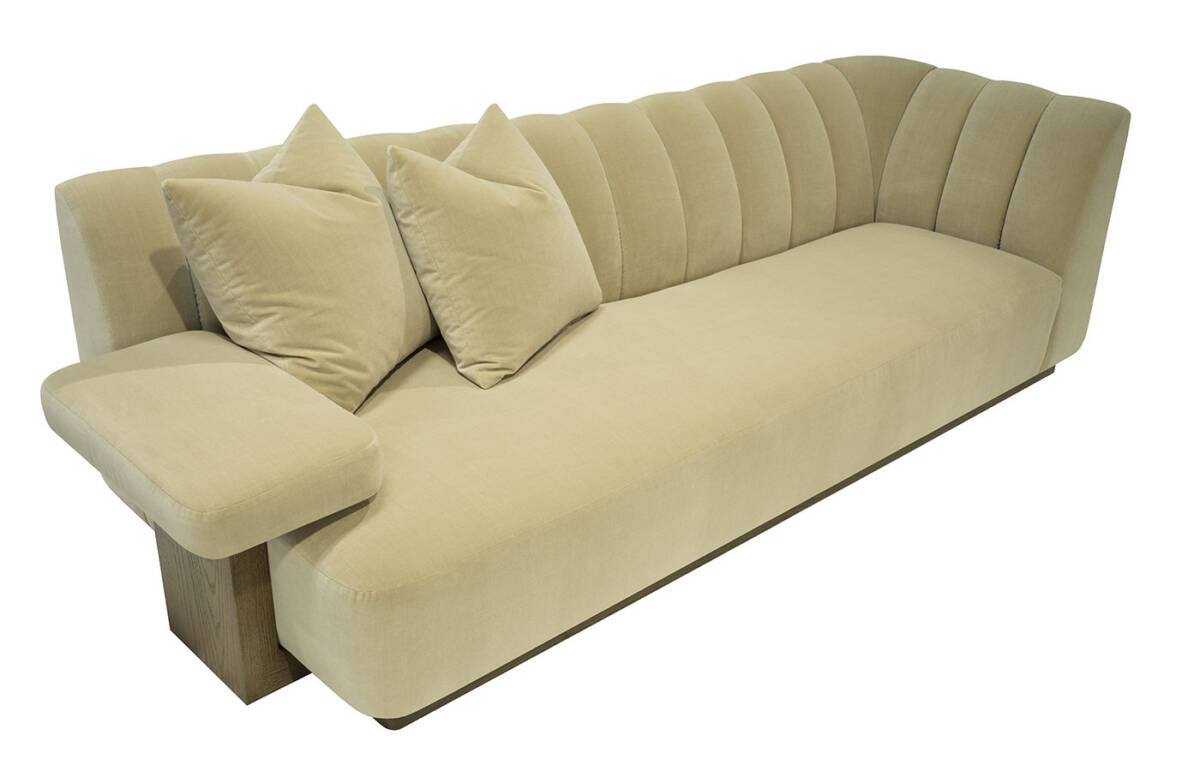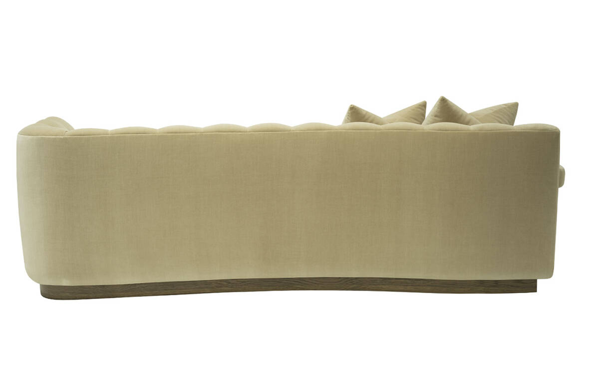 This striking upholstered sofa is as much a statement piece as it is a place of comfort. Its sculptural serpentine silhouette flows with elegance, while the plush channel-tufted interior back creates both visual rhythm and inviting softness. Designed with multiple seating depths, it offers a dynamic mix of lounge-like comfort and upright support, tailored to every preference. Anchored by a substantial wooden base, the piece feels grounded and architectural, balancing organic curves with bold structure. For added versatility, it can also be shown with an optional upholstered armrest, enhancing both style and function.