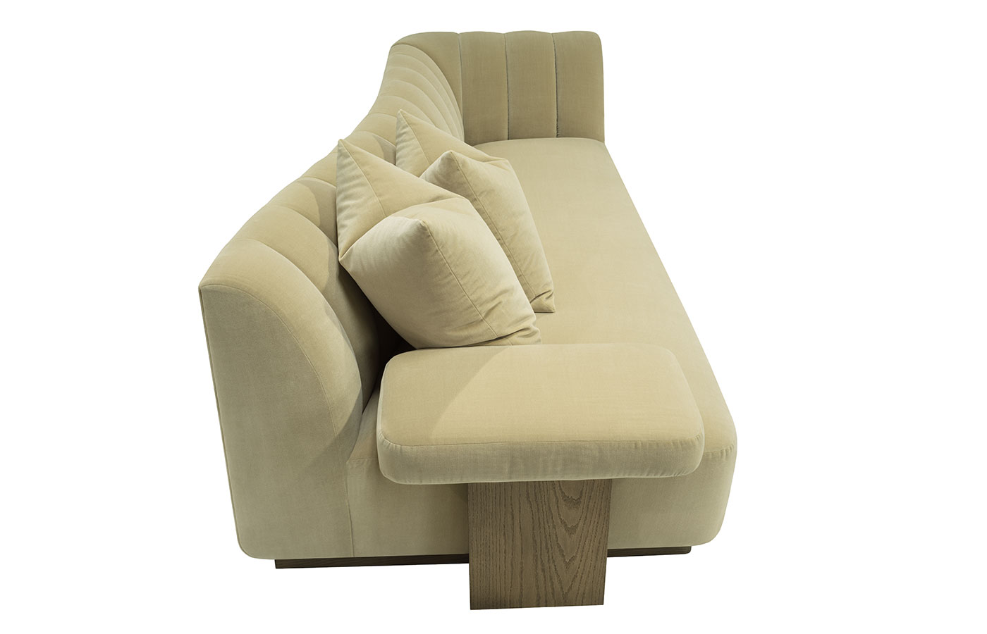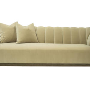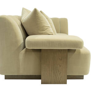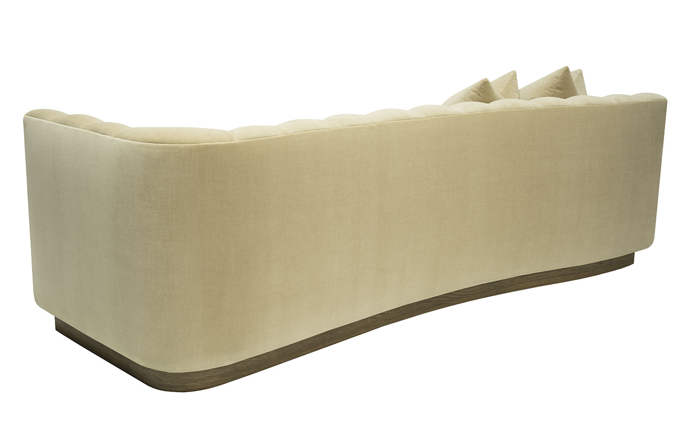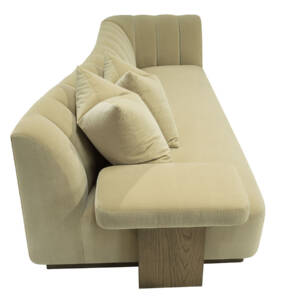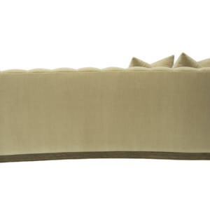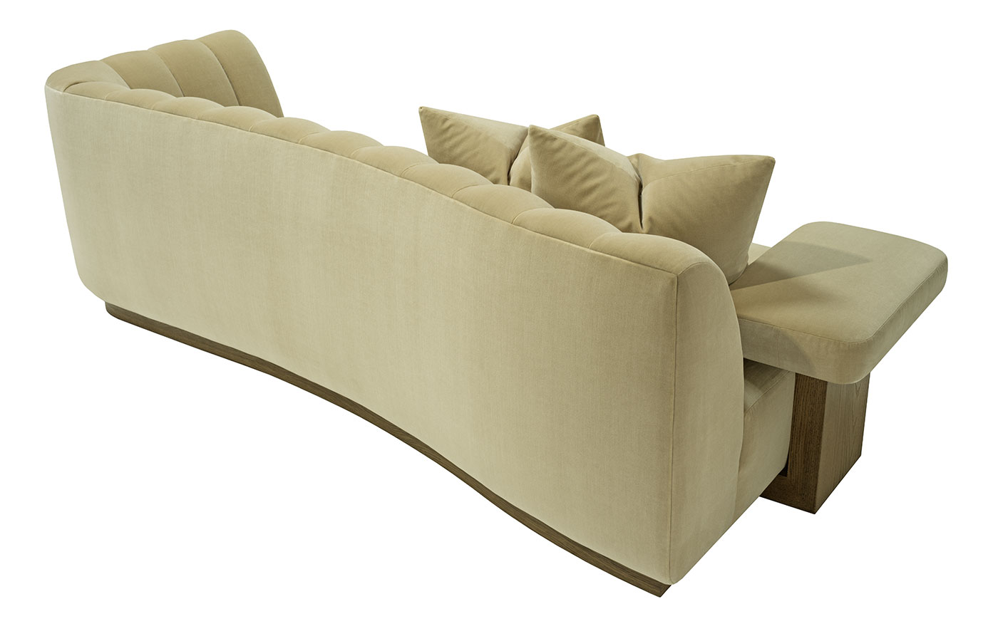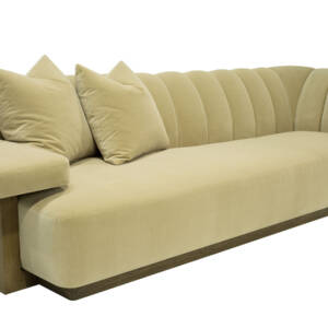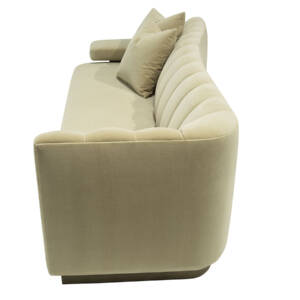 This striking upholstered sofa is as much a statement piece as it is a place of comfort. Its sculptural serpentine silhouette flows with elegance, while the plush channel-tufted interior back creates both visual rhythm and inviting softness. Designed with multiple seating depths, it offers a dynamic mix of lounge-like comfort and upright support, tailored to every preference. Anchored by a substantial wooden base, the piece feels grounded and architectural, balancing organic curves with bold structure. For added versatility, it can also be shown with an optional upholstered armrest, enhancing both style and function.